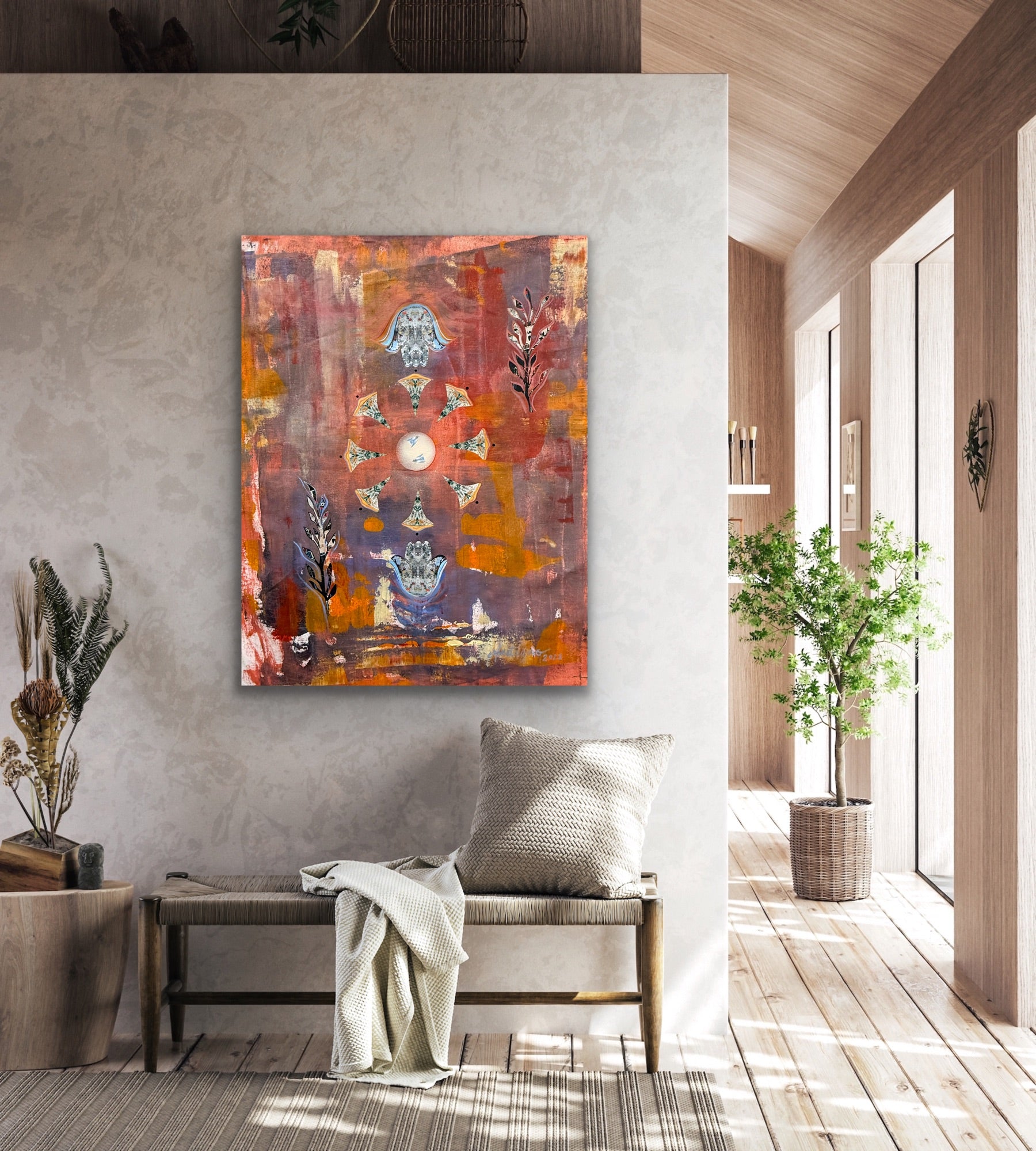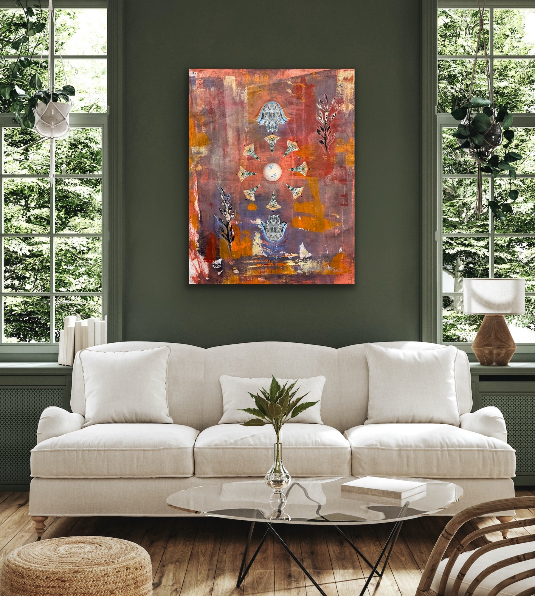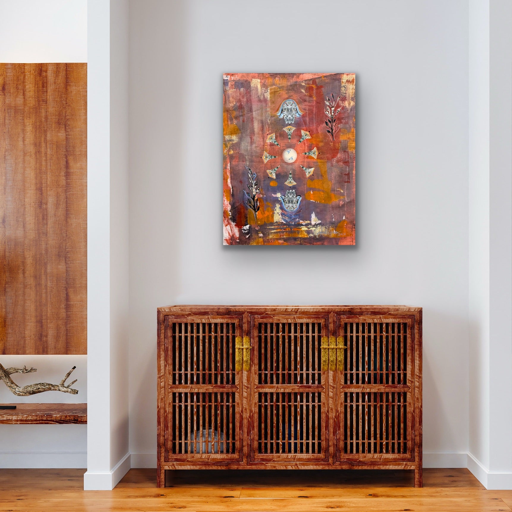 Acrylic, collage & heavy texture on canvas 30Wx36L"x1.5D"