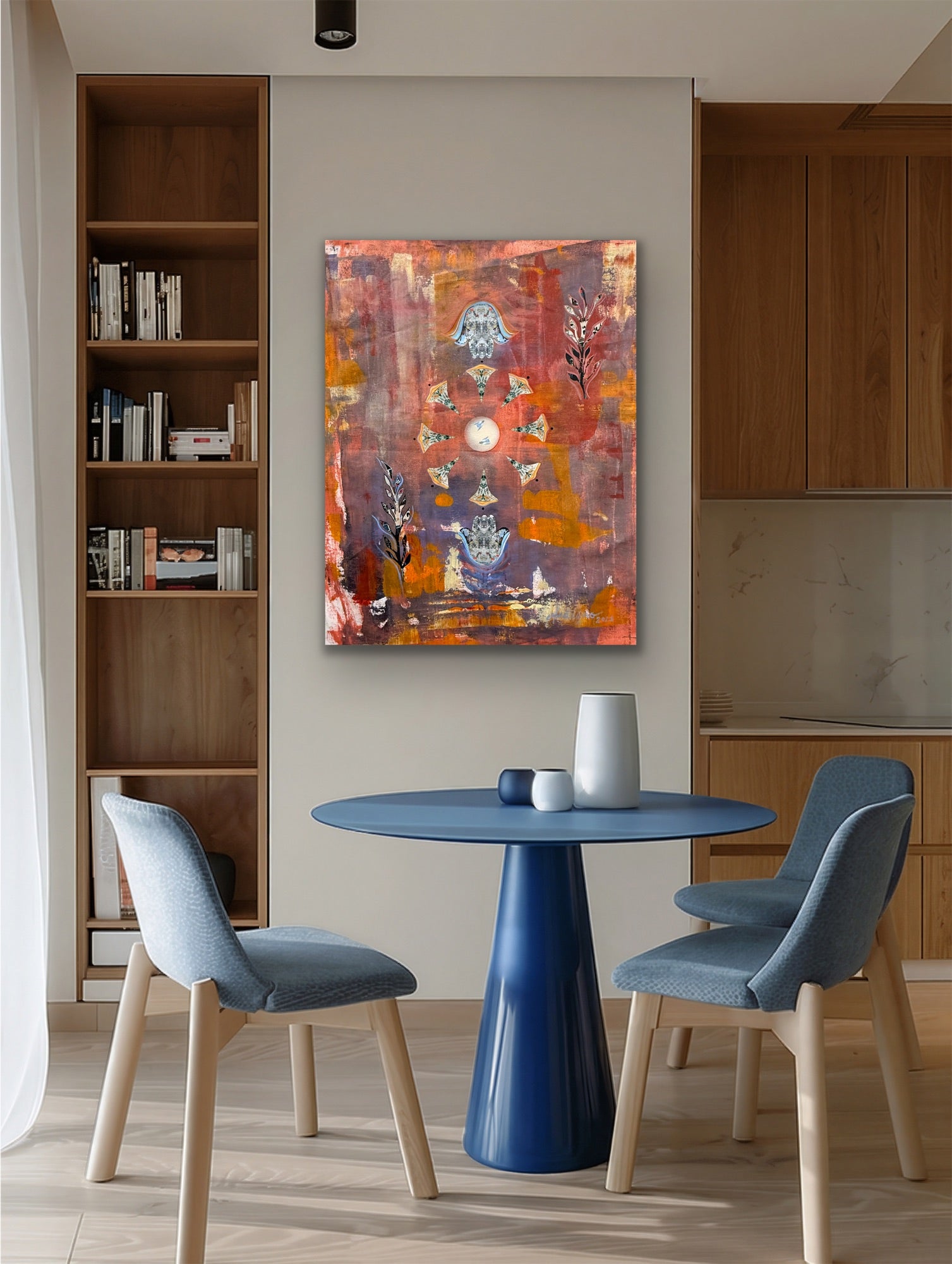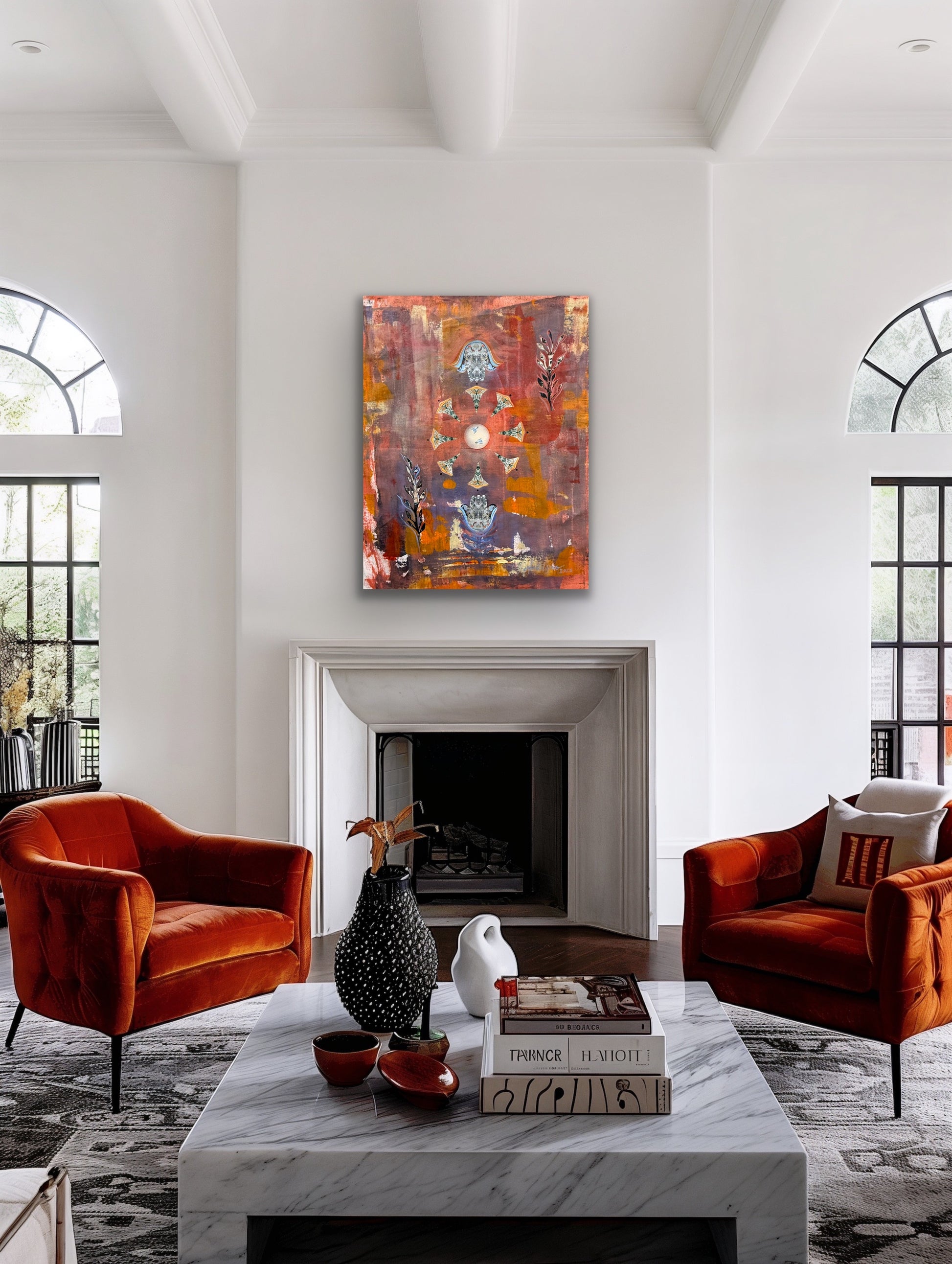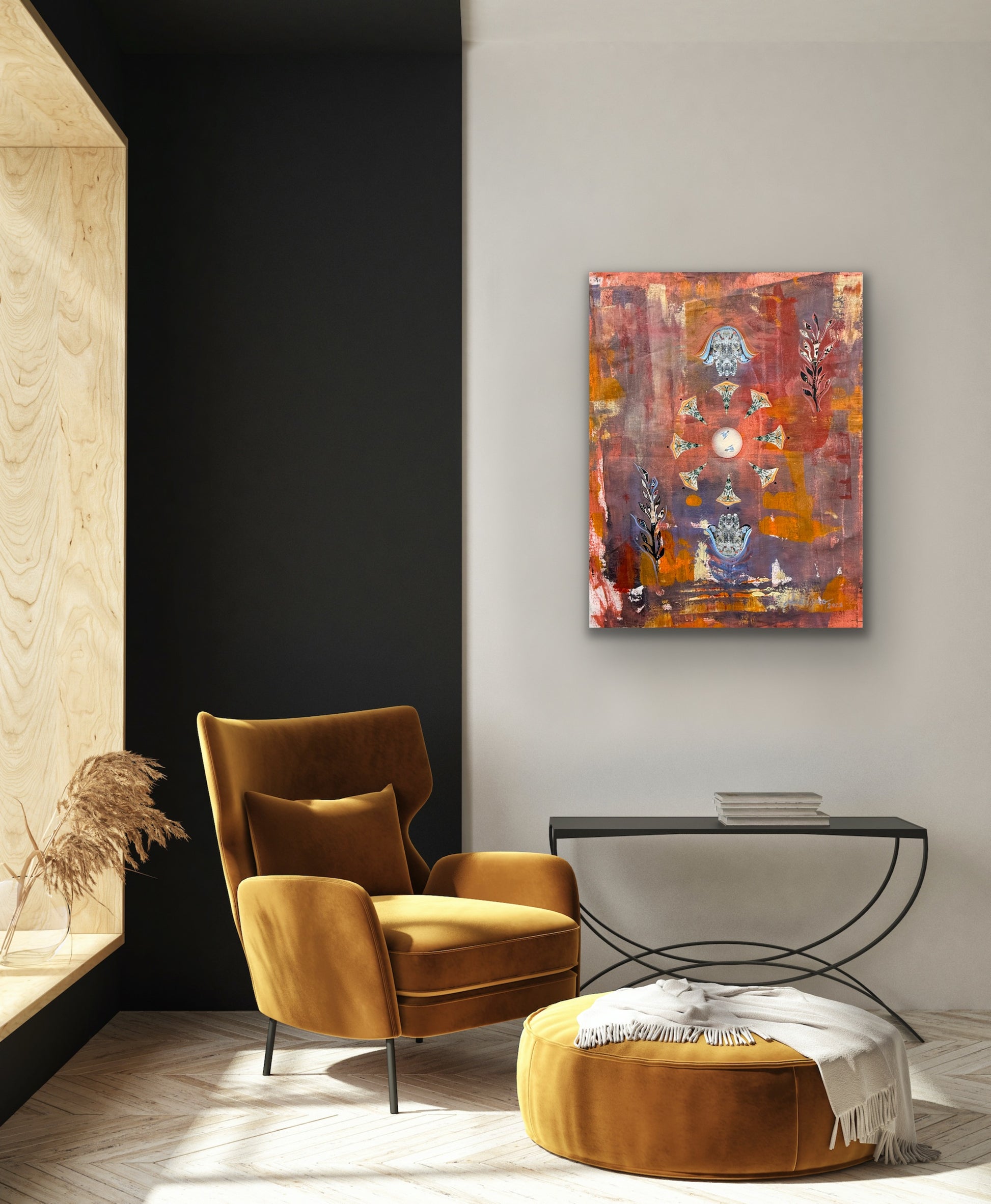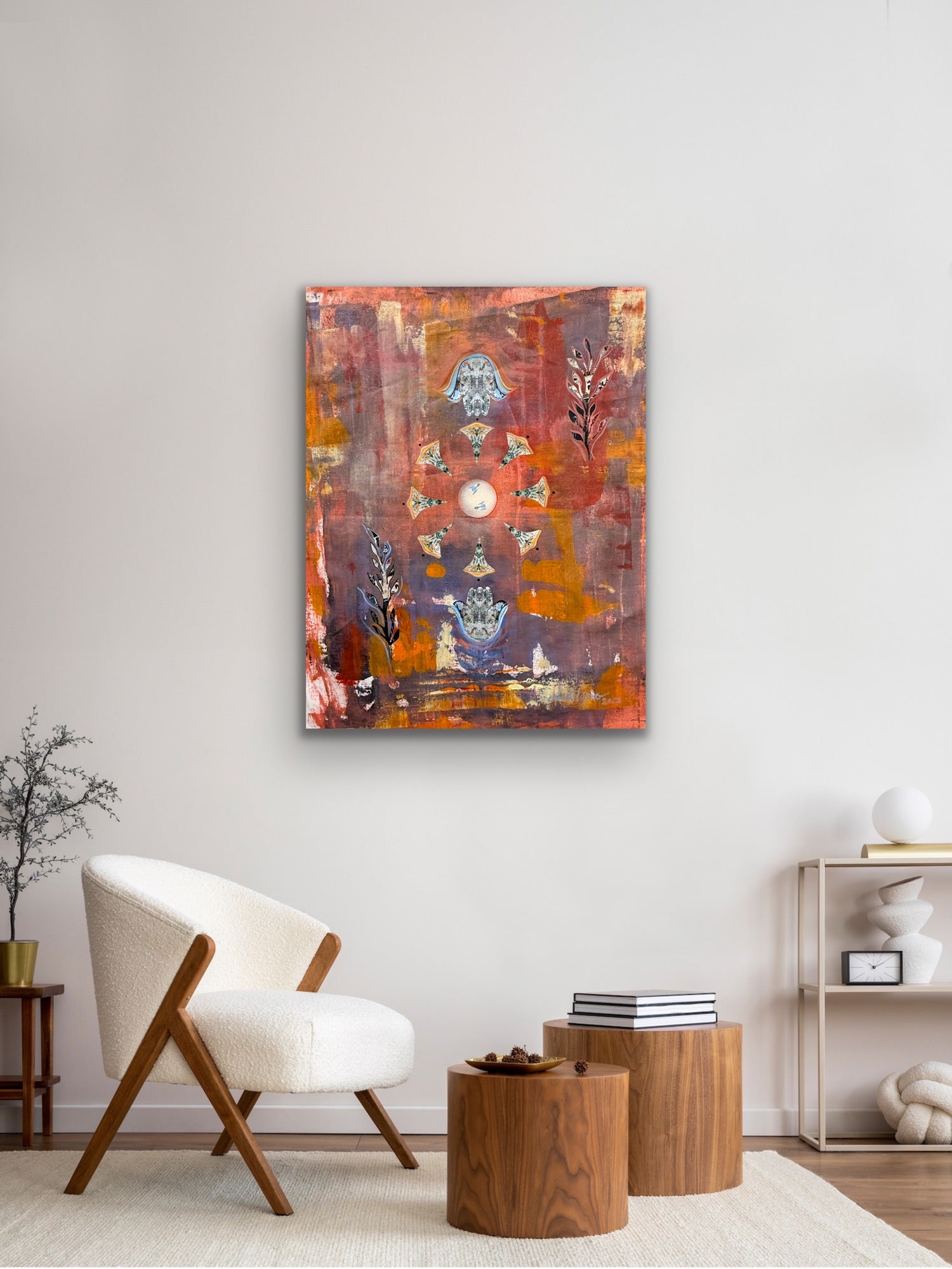 Acrylic, collage & heavy texture on canvas 30Wx36L"x1.5D"
