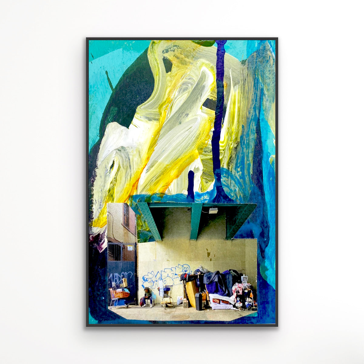 This framed original work is comprised of a mix of my photo prints collaged onto a background that I paint. The artwork was created on a Strathmore 4x6 postcard, the frame is a simple black frame with a glass top that you can easily take the work out from if you decided to send it out into the world. Just add a stamp!