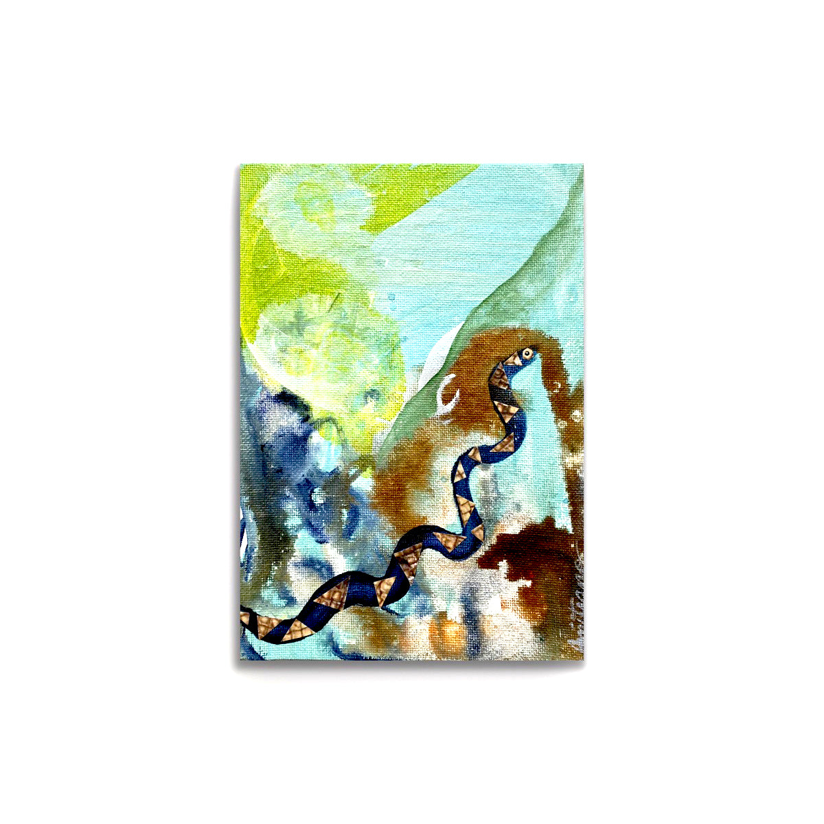 I began this as an abstract landscape piece then saw a snake in the mix and added some cut outs from my prints to create a snake print.