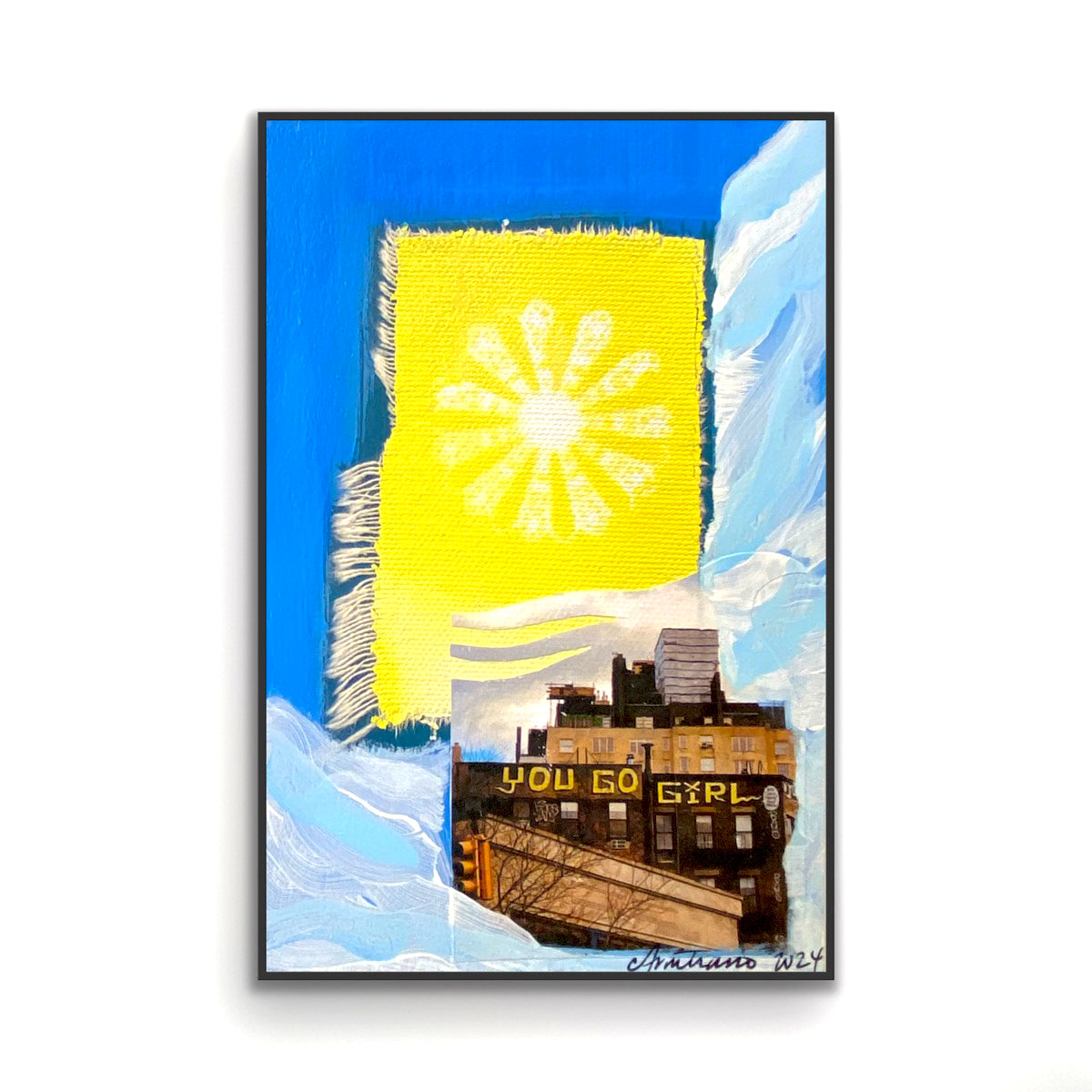 This framed original work is comprised of a mix of my photo prints collaged onto a background that I paint. The artwork was created on a Strathmore 4x6 postcard, the frame is a simple black frame with a glass top that you can easily take the work out from if you decided to send it out into the world. Just add a stamp!
